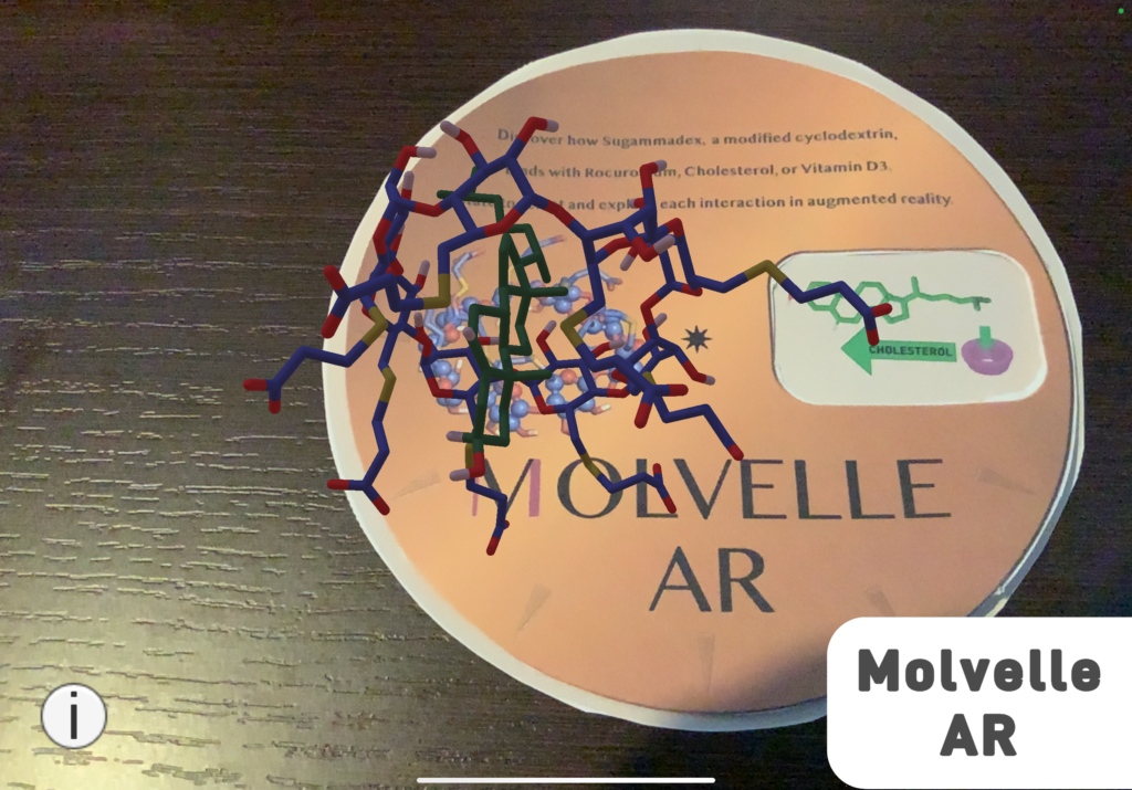Molvelle AR brings you into the molecular world of Sugammadex, a modified cyclodextrin used to reverse anesthesia effects. This augmented reality app allows you to visualize how Sugammadex binds with Rocuronium—a muscle relaxant crucial in anesthetic procedures—as well as with Cholesterol and Vitamin D3. Using molecular dynamics simulations (originally conducted in water, with solvent removed for clarity), the app provides an immersive experience. Rotate the interactive volvelle to switch between ligands and observe each binding interaction in detail, making this app a valuable tool for education and research.